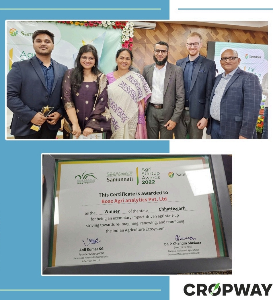 रायपुर। क्रॉपवे (बोआज़ एग्री एनालिटिक्स प्राइवेट लिमिटेड) को , हैदराबाद में “छत्तीसगढ़ राज्य के लिए मैनेज-समुन्नती एग्री-स्टार्टअप अवार्ड्स 2022” के विजेता के रूप में सम्मानित किया गया। इस समारोह में 2 से 7 साल पुरानी 250 से ज़्यादा एग्रीटेक कंपनियों ने हिस्सा लिया जिसमें क्रॉपवे ने अपनी जगह बनाई । विजेताओं को विचार की नवीनता, प्रदर्शन, ग्राहकों की सेवा एवं संतुष्टि, कृषि क्षेत्र एवं किसानो के बीच किये कार्यो एवं प्रभाव के आधार पर निर्णायक समिति द्वारा चुना गया है। इस समारोह में मुख्य अतिथि के रूप में भारत सरकार के कृषि एवं किसान कल्याण विभाग मंत्री सुश्री शोभा करंदलाजे , विशिष्ट अतिथि अनिल कुमार एस.जी., संस्थापक और समूह सीईओ, समुन्नती; और डॉ. पी. चंद्रशेखर, महानिदेशक, राष्ट्रीय कृषि विस्तार प्रबंधन संस्थान (मैनेज) थे । समारोह का उद्देश्य भारतीय कृषि पारिस्थितिकी तंत्र को प्रभावित करने वाले मुद्दों पर कड़ी मेहनत करने वाले एग्रीटेक उद्यमियों की नई पीढ़ियों को प्रोत्साहित करना और प्रेरित करना था। समारोह में हकीमुद्दीन सैफी, रितुपर्णा पारियल, मैथ्यू मैकनल्टी और श्लोक अग्रवाल मौजूद थे।