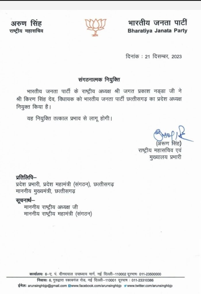 रायपुर। छत्तीसगढ़ भाजपा के प्रदेश अध्यक्ष किरण सिंह देव बने। इनकी नियुक्ति भाजापा के राष्ट्रीय अध्यक्ष जगत प्रकाश नड्डा ने की है। गुरुवार को भाजपा के राष्ट्रीय अध्यक्ष जगत प्रकाश नड्डा के साथ वरिष्ठ भाजपा नेताओं की मौजूदगी में निर्णय लिया गया , जिस पर संगठन के लोगों ने सहमति जताई हैं। नियुक्ति की जानकारी राष्ट्रीय महासचिव अरुण साव ने जारी की है। किरण सिंह देव विधायकी के साथ अब छतीसगढ़ भाजपा प्रदेश अध्यक्ष का जिम्मेदारी सम्हालेंगे।