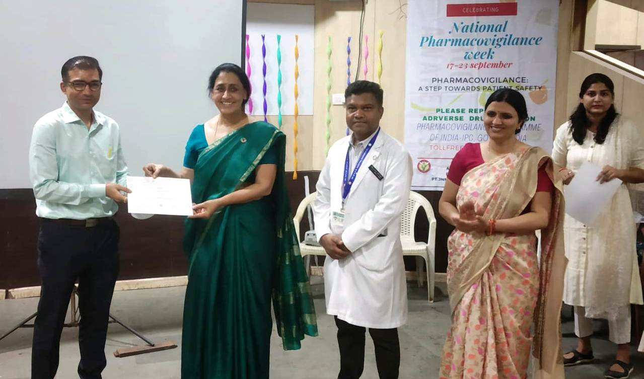 रायपुर. 19 सितम्बर 2022।आमजनों तथा स्वास्थ्य क्षेत्र से जुड़े लोगों को प्रतिकूल दवा प्रतिक्रियाओं (ADR – Adverse Drug Reaction) के सम्बन्ध में जागरूक करने आज रायपुर के पंडित जवाहरलाल नेहरु स्मृति चिकित्सा महाविद्यालय के फार्माकोलॉजी विभाग द्वारा राष्ट्रीय फार्माकोविजिलेंस सप्ताह मनाया गया। डॉ. भीमराव अम्बेडकर स्मृति चिकित्सालय के फिजियोथेरेपी हाल में आयोजित कार्यक्रम में विशेष तौर पर नर्सिंग स्टॉफ को दवाओं के प्रतिकूल प्रभावों की रिपोर्ट फौरन करने को लेकर जागरूक किया गया। मेडिकल कॉलेज की डीन डॉ. तृप्ति नागरिया तथा डॉ. भीमराव अम्बेडकर अस्पताल के अधीक्षक डॉ. एस.बी.एस. नेताम ने एडवर्स ड्रग रिएक्शन की बेहतर रिपोर्टिंग करने के लिए मेडिसीन विभाग के डॉ. आर.एल. खरे और चर्म रोग के विभागाध्यक्ष डॉ. मृत्युंजय सिंह को सम्मानित किया।