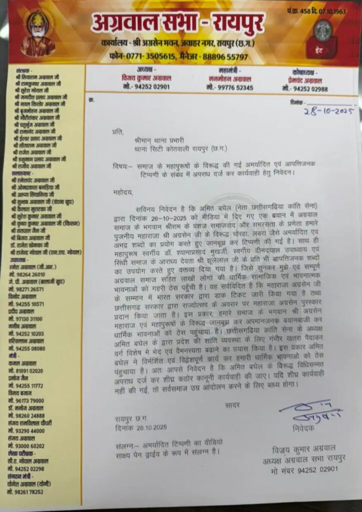 रायपुर, 28 अक्टूबर 2025।अग्रवाल सभा रायपुर ने छत्तीसगढ़िया कांति सेना के नेता अमित बघेल के खिलाफ कड़ी नाराजगी व्यक्त करते हुए थाना सिटी कोतवाली रायपुर में लिखित शिकायत दर्ज कराई है।