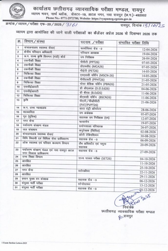 रायपुर, 15 अक्टूबर 2025। छत्तीसगढ़ व्यावसायिक परीक्षा मंडल (व्यापम) ने वर्ष 2026 के अप्रैल से दिसंबर माह तक आयोजित की जाने वाली विभिन्न भर्ती और प्रवेश परीक्षाओं का विस्तृत कैलेंडर जारी कर दिया है। व्यापम भवन, अटल नगर नवा रायपुर से जारी आदेश क्रमांक एफ-20/2025/3161 के अनुसार कुल 31 प्रमुख परीक्षाएं प्रस्तावित की गई हैं।