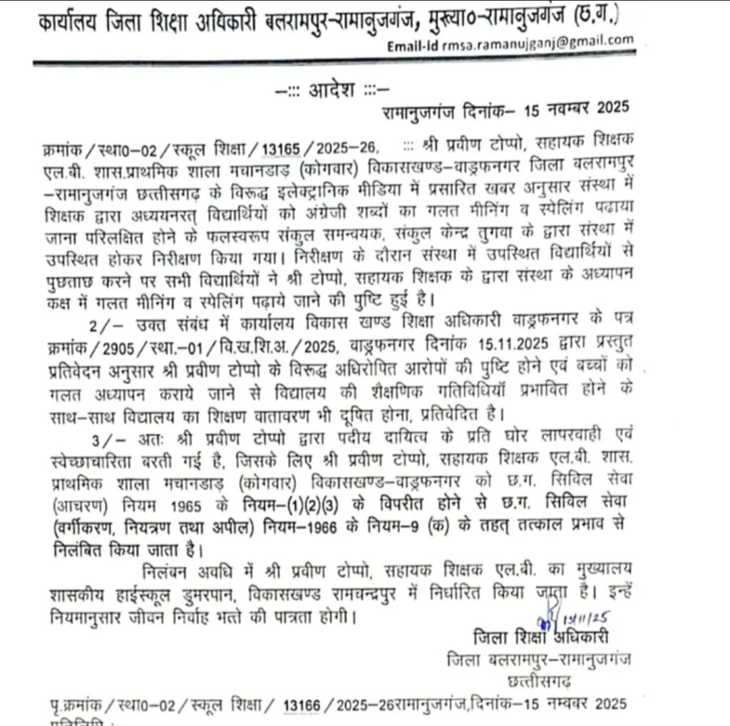 मामले को गंभीरता से लेते हुए जिला शिक्षा अधिकारी बलरामपुर-रामानुजगंज एम.आर. यादव ने सहायक शिक्षक प्रवीण टोप्पो को तत्काल प्रभाव से निलंबित करने का आदेश जारी किया।
