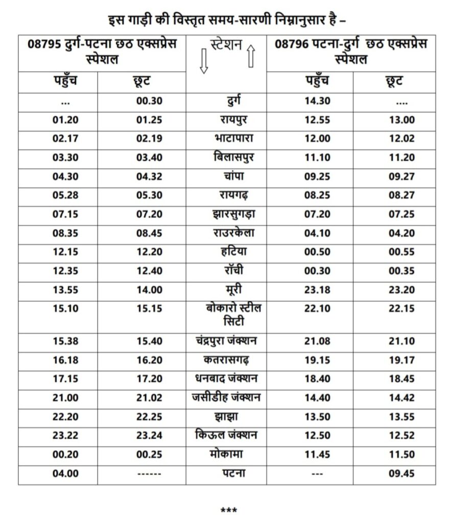 यह ट्रेन दुर्ग से पटना और पटना से दुर्ग के बीच चलेगी, जिससे छठ मनाने घर लौटने वालों को बड़ी सुविधा मिलेगी। रेलवे प्रशासन का कहना है कि इस ट्रेन में अतिरिक्त कोच भी जोड़े गए हैं ताकि यात्रियों को आरामदायक यात्रा मिल सके।