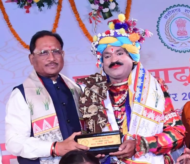 छत्तीसगढ़ की पारंपरिक लोक कला के संरक्षण एवं संवर्धन के लिए मुख्यमंत्री विष्णु देव साय ने किया डॉ. पुरुषोत्तम चंद्राकर कों सम्मानित