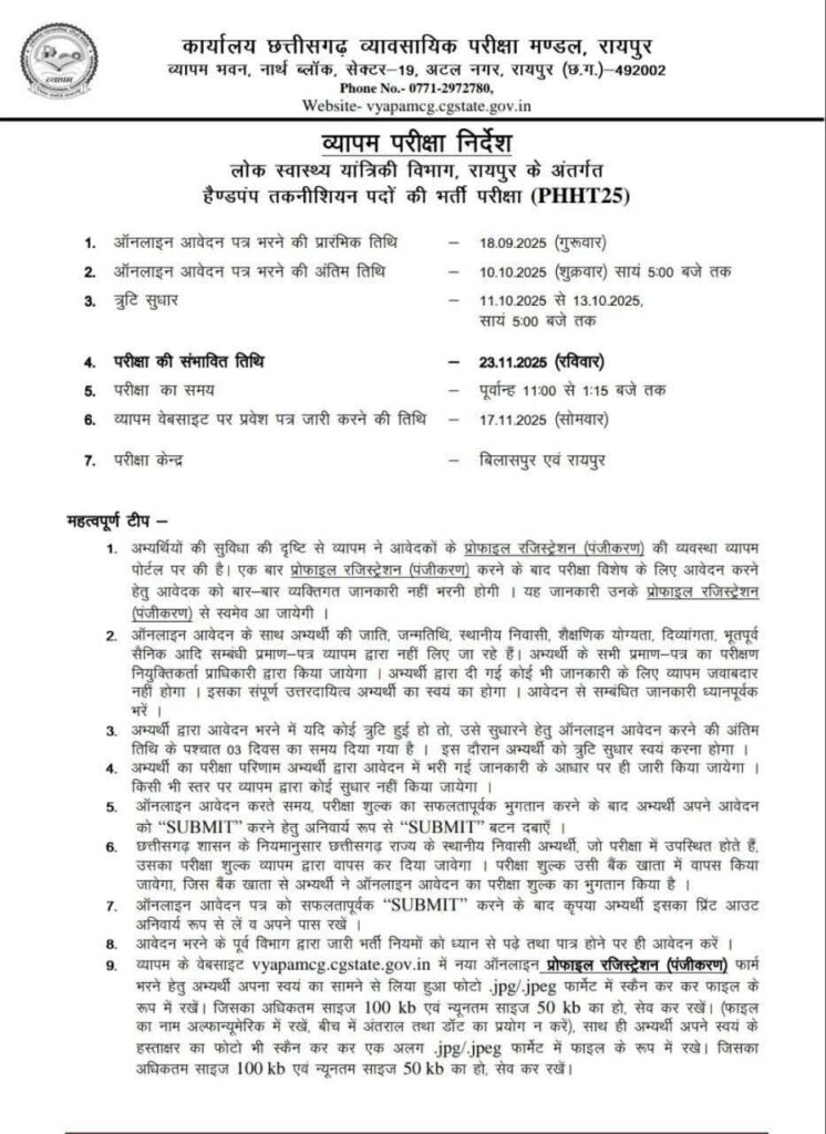आवेदन व्यापम की आधिकारिक वेबसाइट vyapamcg.cgstate.gov.in पर ही किए जाएंगे।