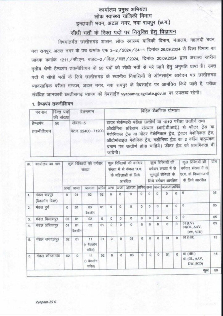 रायपुर। लोक स्वास्थ्य यांत्रिकी विभाग, छत्तीसगढ़ द्वारा हैण्डपंप तकनीशियन के 50 पदों पर सीधी भर्ती की जाएगी। इसके लिए छत्तीसगढ़ व्यावसायिक परीक्षा मंडल (व्यापम) ने ऑनलाइन आवेदन आमंत्रित किए हैं। केवल छत्तीसगढ़ के स्थानीय निवासी ही इन पदों के लिए पात्र होंगे।