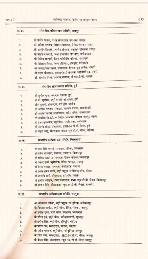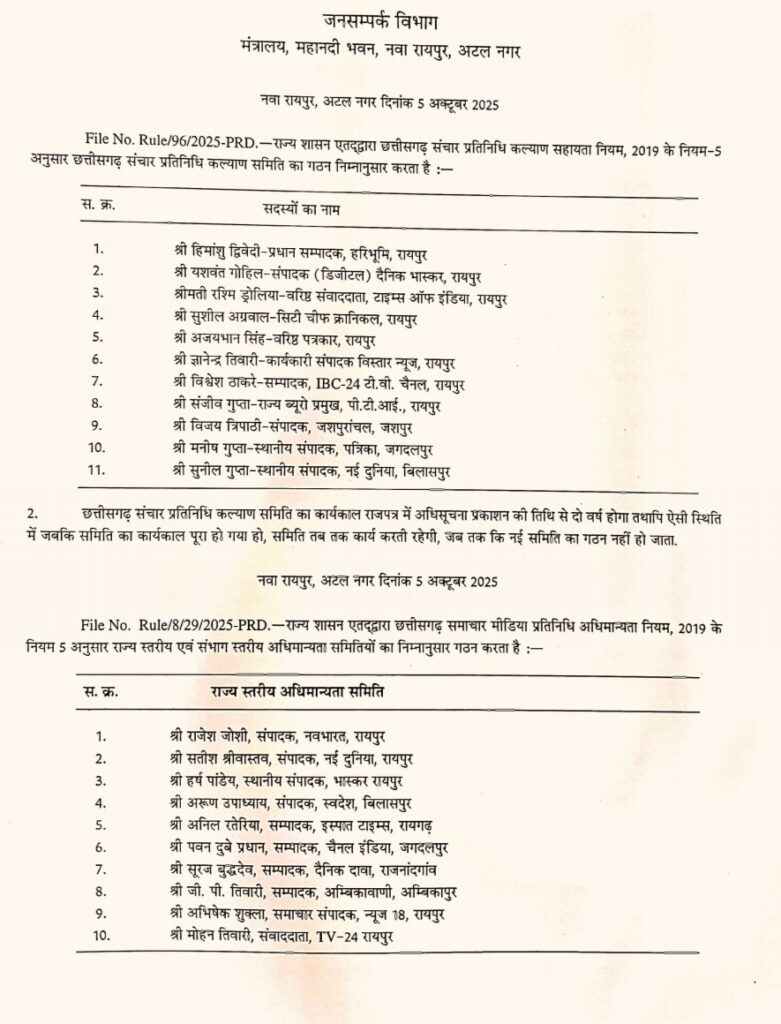 रायपुर।राज्य शासन ने छत्तीसगढ़ समाचार मीडिया प्रतिनिधि अधिमान्यता नियम, 2019 के तहत राज्य स्तरीय और संभागीय अधिमान्यता समितियों का गठन किया है। यह समितियाँ पत्रकारों की अधिमान्यता संबंधी मामलों की समीक्षा और अनुशंसा करेंगी।