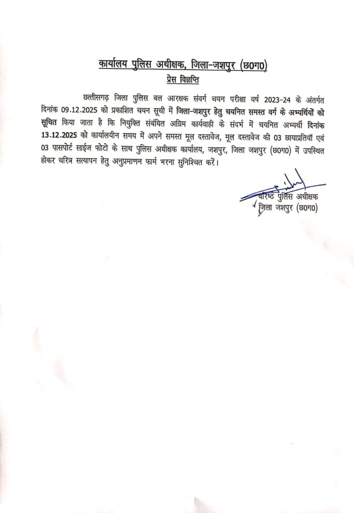 जशपुर। छत्तीसगढ़ जिला पुलिस बल आरक्षक संवर्ग चयन परीक्षा वर्ष 2023-24 में चयनित जशपुर जिले के सभी वर्गों के अभ्यर्थियों को 13 दिसंबर को पुलिस अधीक्षक कार्यालय में दस्तावेज़ सत्यापन हेतु उपस्थित होने कहा गया है।