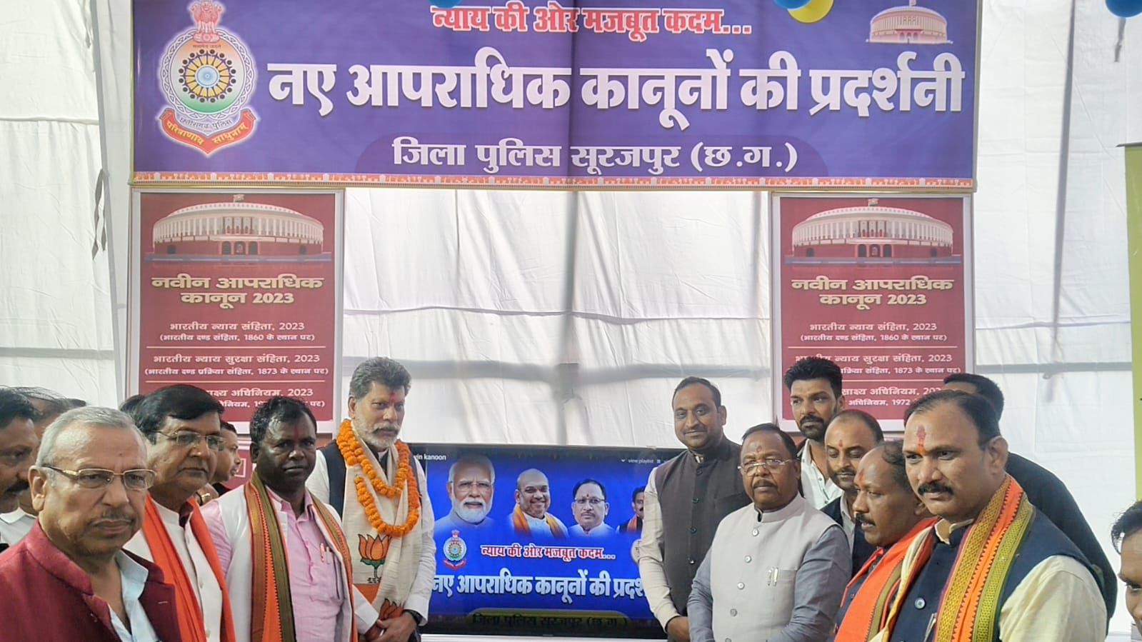 सूरजपुर। नए आपराधिक कानूनों के प्रावधानों एवं बदलाव को लेकर सूरजपुर पुलिस द्वारा कोतवाली परिसर में नए आपराधिक कानूनों की प्रदर्शनी का आयोजन किया गया। गुरुवार, 27 नवम्बर 2025 को इस प्रदर्शनी का स्वास्थ्य मंत्री श्याम बिहारी जायसवाल, कृषि मंत्री रामविचार नेताम, प्रदेश अध्यक्ष किरण सिंहदेव, प्रदेश संगठन महामंत्री पवन साय तथा विधायक प्रेमनगर भूलन सिंह मरावी ने अवलोकन किया।