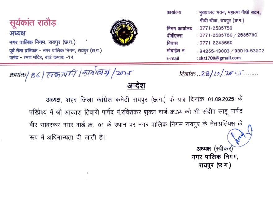 नगर निगम मुख्यालय भवन महात्मा गांधी सदन, गांधी चौक रायपुर से जारी इस आदेश के बाद नेतृत्व परिवर्तन की औपचारिक पुष्टि हो गई है।