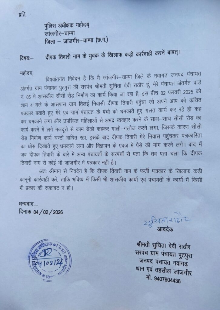 जांजगीर-चांपा।जिले में पत्रकारिता की आड़ में दबंगई और अवैध वसूली का एक गंभीर मामला सामने आया है। नवागढ़ जनपद पंचायत अंतर्गत ग्राम पंचायत पुटपुरा में एक युवक पर स्वयं को पत्रकार बताकर शासकीय विकास कार्य में बाधा डालने, पंचायत प्रतिनिधियों को धमकाने और पैसों की मांग करने का आरोप लगा है। मामले को लेकर ग्राम पंचायत की सरपंच ने पंचों के साथ पुलिस अधीक्षक कार्यालय पहुंचकर लिखित शिकायत सौंपते हुए कानूनी कार्रवाई की मांग की है।