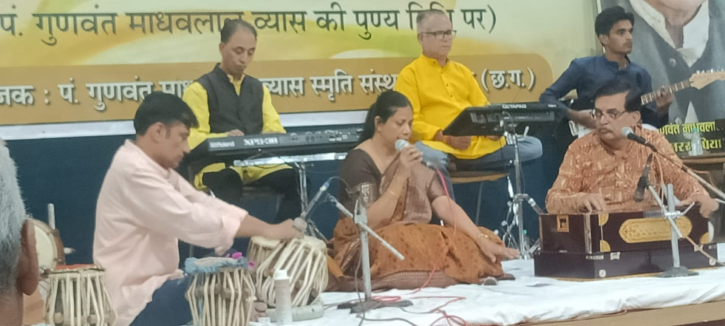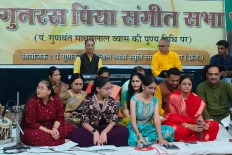 रायपुर (News27) 22.10.2024 । संगीताचार्य पण्डित गुणवंत माधवलाल व्यास जी की 14 वीं पुण्यतिथि पर गुनरस पिया संगीत सभा 2024 का आयोजन 20 अक्टूबर को वृन्दावन सभागृह रायपुर में किया गया। शास्त्रीय संगीत के प्रति विगत 13 वर्षों से लगातार कार्य कर रही संस्था गुनरस पिया फाऊंडेशन ने इस वर्ष के आयोजन को गुनरस पिया जी की कृतियों पर केंद्रित कर किया। कार्यक्रम के मुख्य अतिथि पी डी रमानी जी, कार्यक्रम अध्यक्षा सुश्री सरोज पाण्डेय एवं विशेष अतिथि महेन्द्र तिवारी द्वारा दीप प्रज्ज्वलित कर समारोह का शुभारंभ किया गया। कवि कौशल महंत द्वारा गुरुजी के व्यक्तित्व पर रचित गीत को सभी विद्यार्थियों ने समवेत स्वरों में प्रस्तुत कर श्रोताओं को भाव विभोर कर दिया । अपने अध्यक्षीय उद्बोधन में सरोज पाण्डे ने संस्था की संगीत सेवा के कार्यों की खूब तारीफ की। मुख्य अतिथि रमानी ने पण्डित व्यास के व्यक्तित्व से संबंधित बातों को साझा किया उन्होंने संस्था के प्रयासों में हर संभव सहयोग का भी आश्वासन दिया। शासकीय दिव्यांग महाविद्यालय माना के बच्चों ने गुनरस पिया जी द्वारा रचित देश भक्ति गीत एवं भजन की प्रस्तुति दी। गुनरस पिया जी द्वारा रचित, स्वरबद्ध बंदिशों, गीत, गज़़लों एवं भजनों को संस्थान के कलाकारों ने प्रस्तुत कर देर रात तक श्रोताओं को मंत्रमुग्ध कर दिया। कार्यक्रम में तबले पर सुशील गोल्हानी, किबोर्ड पर रियाज़ भाई, पैड पर शिव मिश्रा, ढोलक पर विनोद सिंह तथा हारमोनियम पर दीपक व्यास ने सुंदर संगत दी। गुरुजी का जीवन परिचय कु कावेरी व्यास ने एवं संस्थान का परिचय महेन्द्र तिवारी ने प्रस्तुत किया। कार्यक्रम में सूत्रधार रहीं श्रीमती शुभ्रा ठाकुर, आभार प्रदर्शन किया श्रीमती दीपा व्यास ने एवं निर्देशन दीपक गुणवंत व्यास ने किया। कार्यक्रम में देर रात तक बड़ी संख्या में संगीत रसिकों ने अपनी उपस्थिति से कार्यक्रम की गरिमा बढ़ाई।